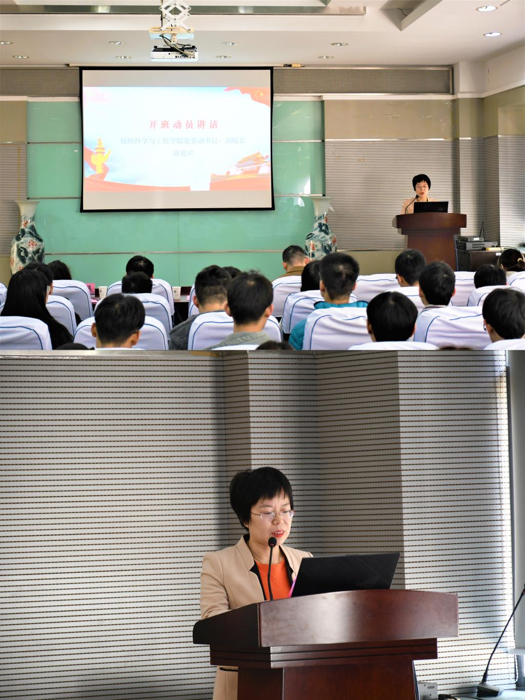 机械工程学院党委副书记、副院长方俊,环境与土木工程学院党委副书记、副院长胡娟,纺织科学与工程学院党委副书记、副院长陈艳君,各学院分党校培训班班主任及全体学员出席了开班典礼,班主任伍胤鸿主持典礼。开班典礼上,班主任伍胤鸿介绍了培训班安排与纪律要求;学员代表轻化1802班陈秋月同学代表全体学员进行了表态发言;纺织科学与工程学院党委副书记、副院长陈艳君作动员讲话,她表示:学员应加强理论学习,不断提高思想认识,在思想政治上做表率、在学习上做标兵、在工作上做典范,争取早日成为一名共产党员。
