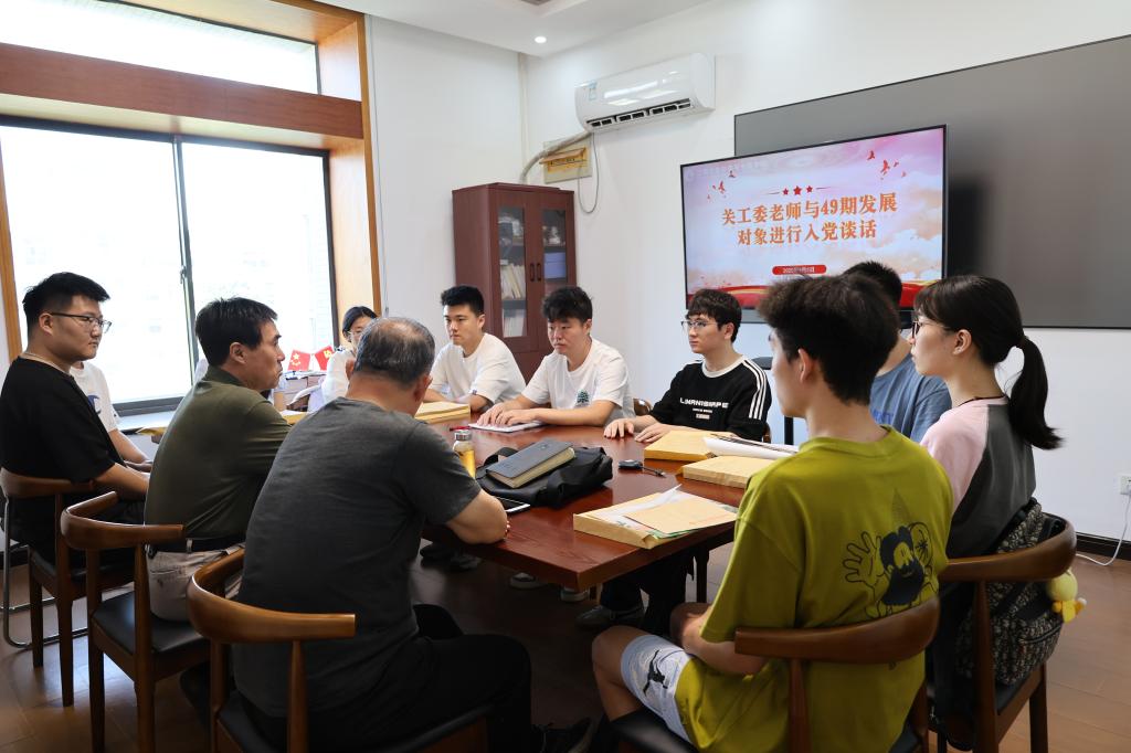 随后衡延笃和黄庆发与2025年上半年发展的学生党员进行了深入的一对一谈话。关工委老同志以倾听和引导的方式,深入了解每位同学的入党动机、对党的认识、理论掌握程度、对时事的看法,并剖析他们的优势与不足,为他们提供了反思和澄清认识的机会。组织员与发展对象的对话,增强了同学们的政治责任感和历史使命感,引导他们深化对党的理解与认同,为青年学子的政治成长和人生发展筑牢思想根基,播下信仰的种子。