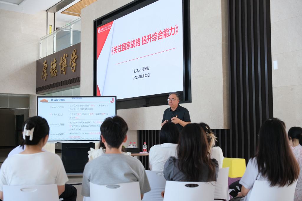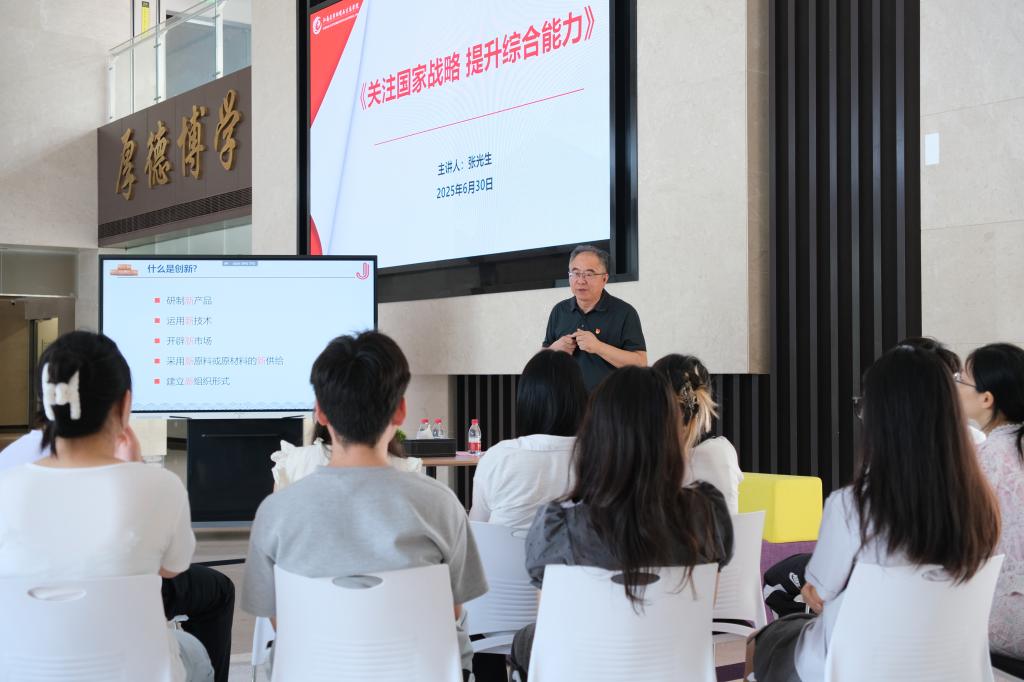 为深入贯彻“青春为中国式现代化挺膺担当”的实践号召,引导青年学生将个人成长融入国家战略,6月30日,18porn 关工委常务副主任、宜兴食品与生物技术研究院院长张光生作《关注国家战略,提升综合能力》主题讲座,并同步举行2025年暑期社会实践出征仪式。学院师生代表、暑期实践团成员共同参与活动,为即将奔赴各地的实践团队注入思想动力与行动指引。