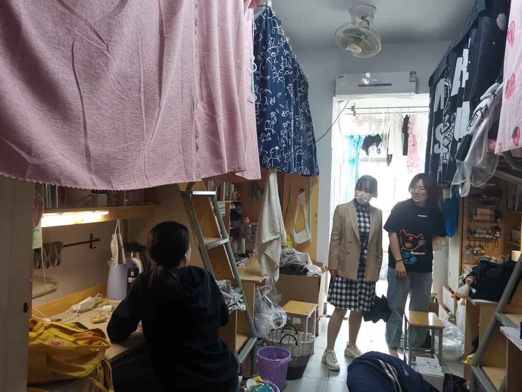 学生宿舍是大学生日常生活和学习的重要场所,是开展大学生思想政治教育的重要阵地。为进一步做好学生宿舍的疫情防控工作,落实学校关于疫情防控的相关工作要求,了解线上教学期间同学们的学习生活状况,落实立德树人根本任务,构建协同育人工作机制。5月1日上午,由学院党委副书记、副院长胡娟带队,全体辅导员共同前往李园、榴园学生宿舍,走访看望在校学生。