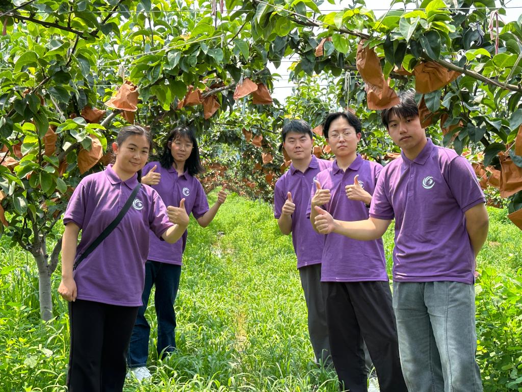 在工作人员的带领下,实践团成员参观了山东省最大的秋月梨生产基地“青青大地秋月梨基地”,参观了种植区、分拣区和装箱区,学习了秋月梨从生产、加工到销售的全过程。随后,实践团来到莱阳乡村振兴赋能中心,作为全省首批、烟台首个省级衔接乡村振兴集中推进区的核心项目,莱阳乡村振兴赋能中心打造了全省乡村振兴齐鲁样板莱阳典范。在讲解员的介绍下,团队成员了解了其创新“六He”乡村振兴区域品牌发展模式,学习其三产融合、以业促兴,乡村振兴“莱阳路径”和共同富裕“莱阳经验”,对“莱阳理解、姜疃实践、人民感受”这一幸福主线产生了深刻共鸣。最后,实践团成员还化身助农主播,向工作人员学习电商直播流程,根据直播受众提前撰写脚本,掌握直播互动话术,积极在抖音、微博、小红书等各大社交平台进行宣传预热,并严格进行梨产品的选品试吃,最终确定梨羹、梨膏糖和梨膏棒棒糖作为主推产品。直播时,实践团成员主线进行莱阳梨的科普,支线进行莱阳梨产品介绍推广,从莱阳的人文历史、莱阳梨的地位、梨产品的功能效用等方面展开科普,快速提高流量,吸引了大批粉丝前来观看。