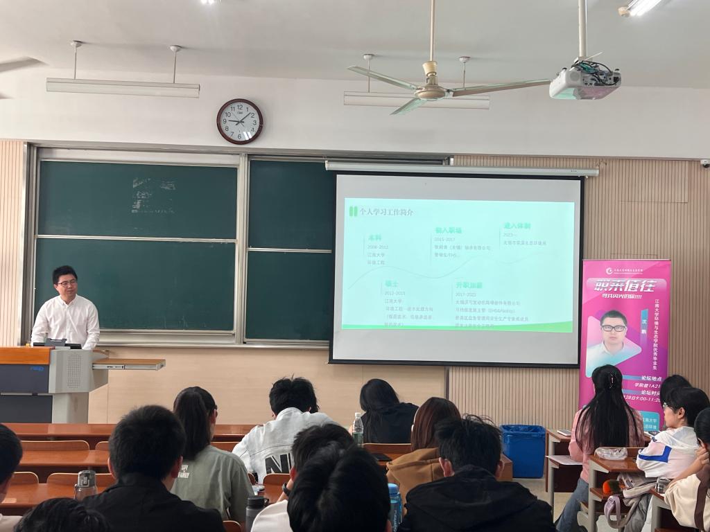 于1A216成功举办“职来值往”主题讲座,本次的主题是“环境工程/科学职业方向与经验分享”。本次讲座特邀就职于无锡市梁溪生态环境局的学院杰出校友沈鹏主讲。