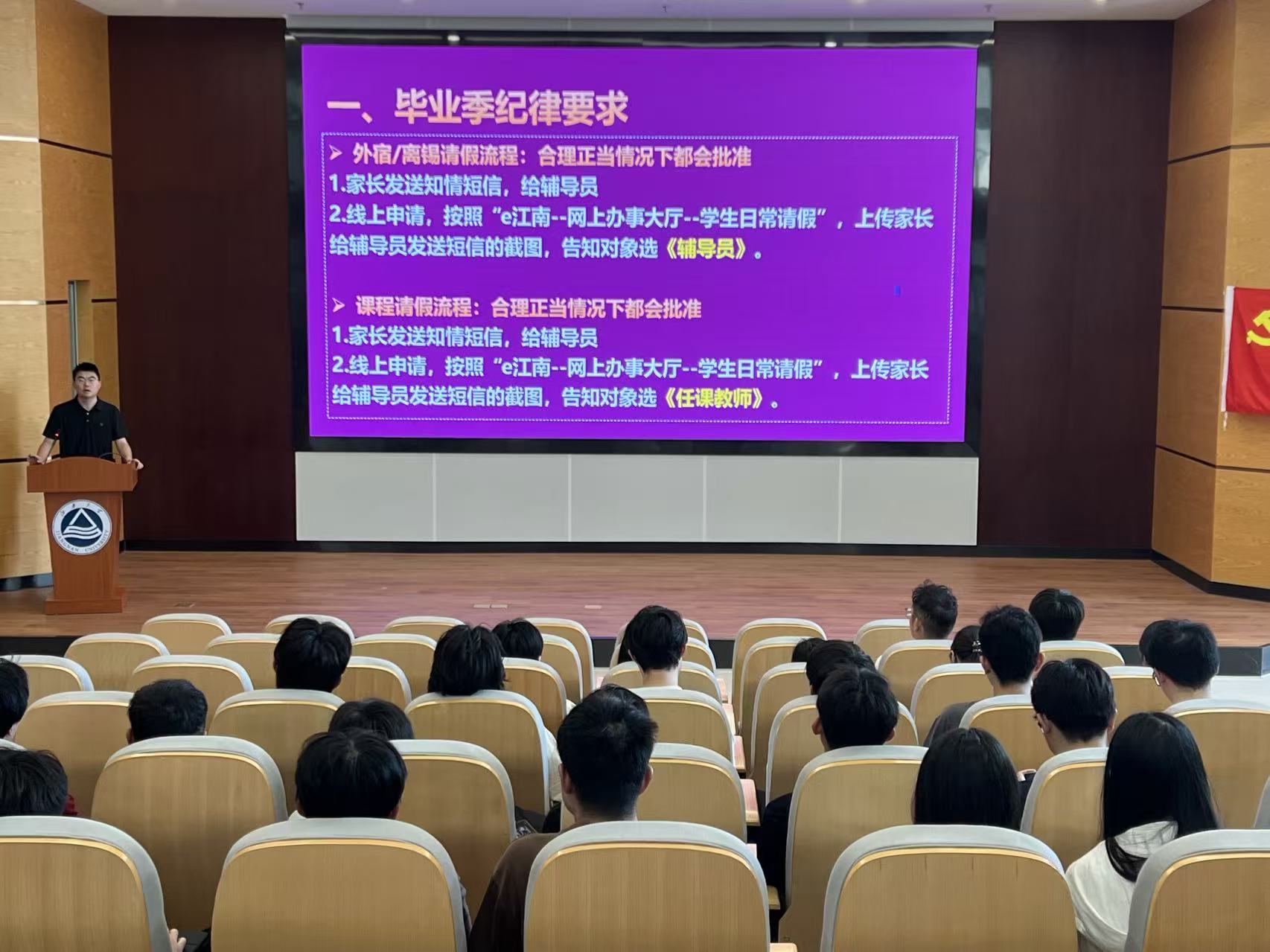 在清源楼(钱盘生楼)101报告厅召开2026届本科毕业生年级大会,围绕毕业季纪律要求、安全提醒、考研升学、考公考编、就业导航与求职技巧等多方面开展专题教育。学院2026届全体本科毕业生参加会议,会议由辅导员李东辉主持。
