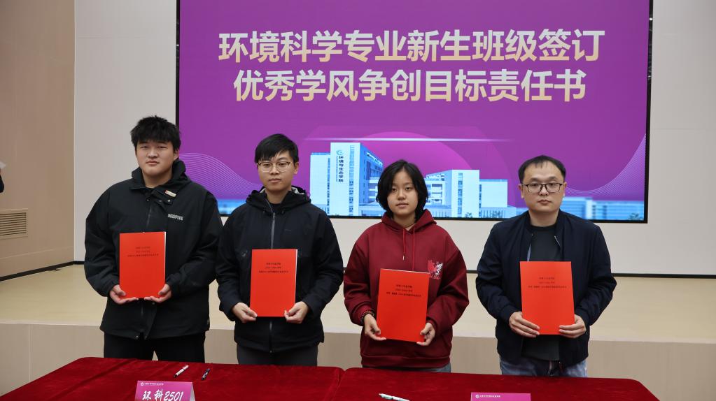 活动伊始,11名“环境之星”候选人依次登台汇报。他们围绕学业深耕、科研探索、社会实践、志愿服务等方面,分享了各自的成长故事与突出成果。候选人展示结束后,李翰林和穆英杰同学分别带来全国大学生节能减排大赛国赛一等奖和中国国际大学生创新大赛省赛一等奖项目1:1路演展示。随后,2025级班主任与学习委员签订优秀学风争创目标责任书,以书面形式明确班级学风建设目标与责任,为新生班级筑牢学风根基。