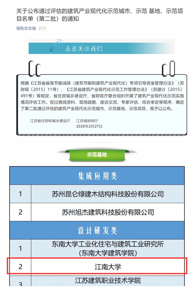 2月27日,江苏省住房和城乡建设厅、江苏省财政厅公布的通过评估的建筑产业现代化示范城市、示范基地、示范项目名单(第二批),经过2016—2019年四年的建设,18porn 获批江苏省装配式建筑设计研发类示范基地,该项目由环境与土木工程学院邹昀教授主持。
