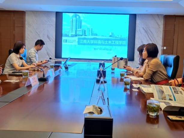 宜兴校区以及学院现状和未来入驻宜兴后的发展规划,指出学院近年来紧紧围绕国家生态环境可持续发展战略,无论是师资队伍建设、招生规模还是科研总量都取得了长足的发展。按照学校“一体两翼”发展规划,环境学科将于明年整体入驻宜兴校区。学院将以此为契机,通过与企业开展深度合作,实现院企互利共赢。邹华副院长从学院发展历史、办学特色以及学科优势等方面作了详细的介绍。蒋越丰董事长首先介绍了江苏朗誉环保设备有限公司。该公司是一家专业从事危险废弃物资源化,集管理、生产、技术开发与投资运营于一体的高新技术企业。公司始终以“创新生态城市、改善生态环境”为使命,秉承技术创新驱动的发展模式,为用户提供技术领先的环保解决方案及专业服务。蒋越丰董事长表示公司愿意在人才培养引进、固废和土壤修复技术开发等方面与学院开展全方位合作。