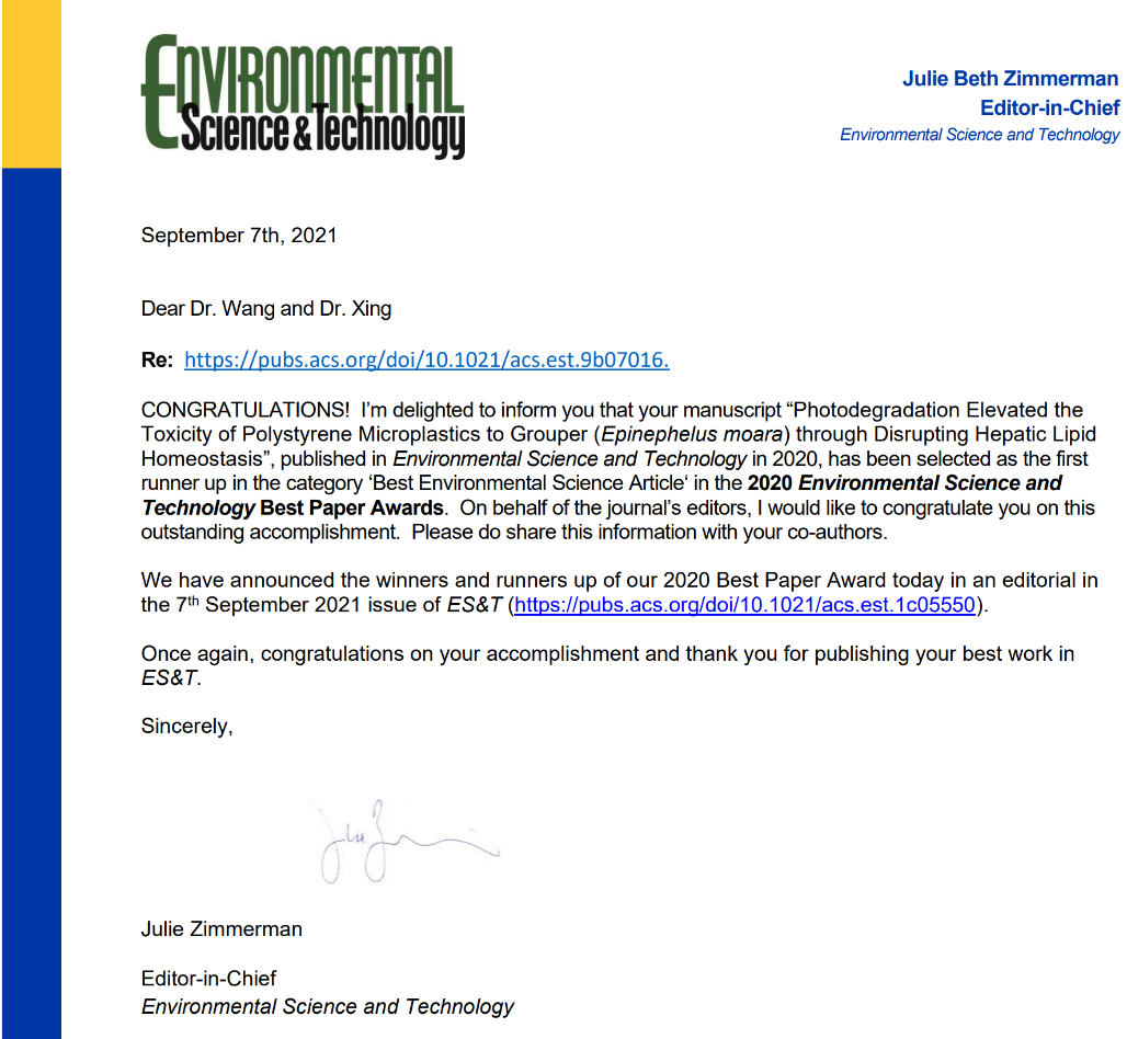 环境与土木工程学院王震宇教授和美国麻省大学安姆斯特分校Baoshan Xing(邢宝山)教授为共同通讯作者,于2020年3月24日在ES&T发表的封面论文“Photodegradation Elevated the Toxicity of Polystyrene Microplastics to Grouper (Epinephelus moara) through Disrupting Hepatic Lipid Homeostasis”,荣获2020年度最佳论文奖(环境科学类第2名,共4项)。研究团队聚焦于全球高度关注的微塑料污染的热点生态环境问题,揭示了聚苯乙微塑料光降解的途径和机制,定量评估了光降解产物纳米塑料颗粒和内源化学污染物的产率;从生理代谢、细胞毒性和基因调控方面阐明了光降解的聚苯乙烯微塑料对海洋生物云纹石斑鱼的肝脏毒性机制。该研究首次揭示了微塑料光降解行为对其生物毒性效应的调控机制,加深了对环境自然老化过程中微塑料的环境行为和生态风险影响的科学认识,为微塑料的生态风险评估提供了重要的理论依据。