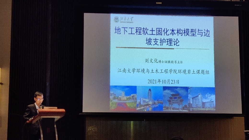 我校环境与土木工程学院刘文化副教授受邀作了题为《地下工程软土固化本构模型与边坡支护理论》的学术报告,主要讲述了固化软土的水力-力学与变形特性、本构模型以及非饱和边坡支护理论等方面的研究成果,报告内容生动,引起与会人员的广泛交流与探讨。