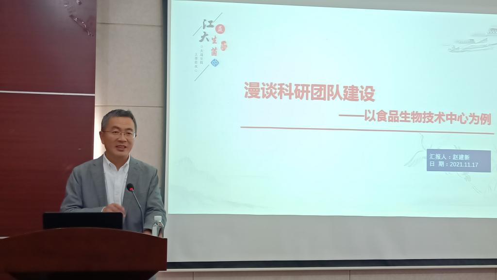 招生就业处处长、食品生物技术中心主任赵建新教授在环境与土木工程学院D303会议室作了题为“漫谈科研团队建设”的报告,院长王震宇,院党委副书记兼副院长胡娟,副院长邹华、王新华,全体学院教职工参与学习。报告会由院党委书记李艳主持。