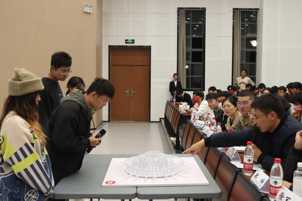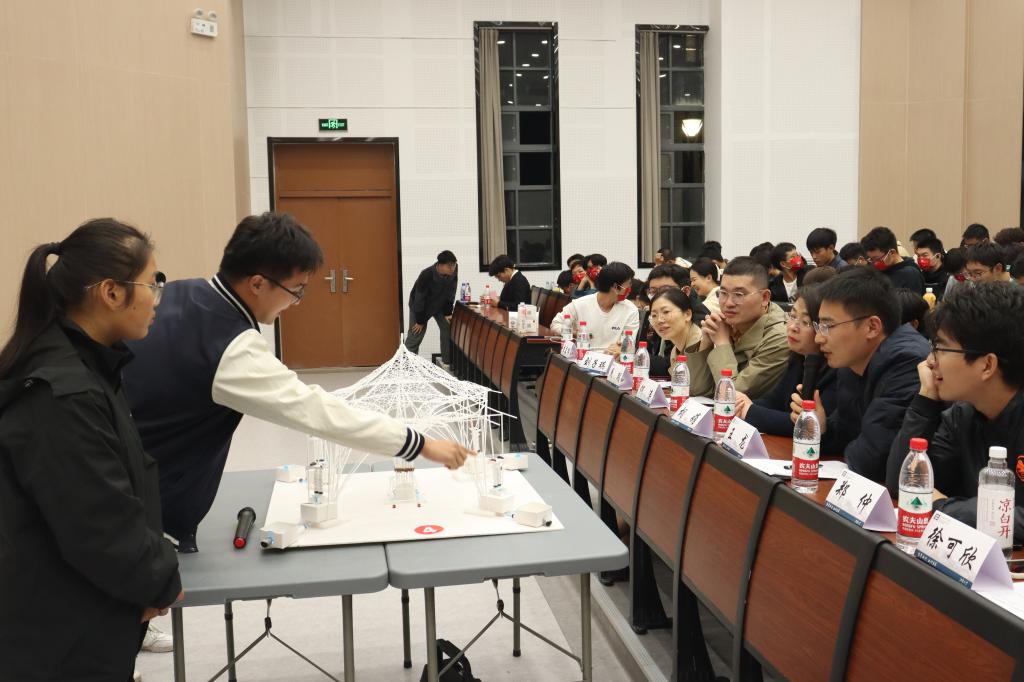 来自环境与土木工程学院、机械工程学院、设计学院、纺织科学与工程学院、物联网工程学院的12支决赛队伍进行激烈角逐,决赛采用团队展示与答辩相结合的形式,每组选手分别展示模型设计及其功能,评委老师围绕模型创新性、材料合理性、力学概论、制作工艺四部分进行评分。