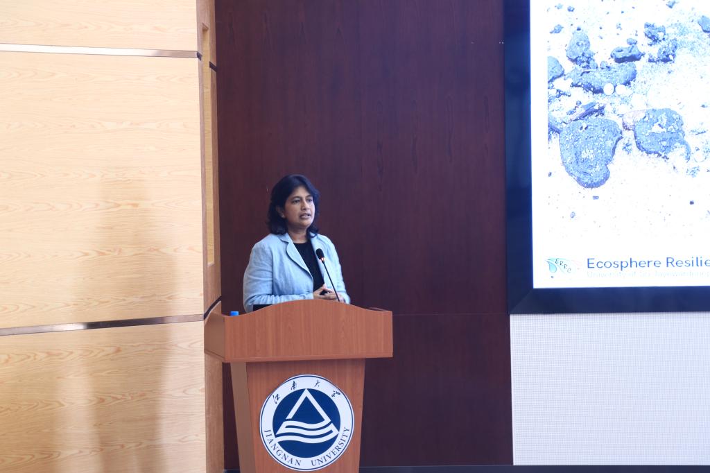 在讲座中,Meththika Vithanage教授介绍了生态圈弹性研究中心最近的研究进展,以2021年5月“X-Press珍珠号”货船在科伦坡港附近发生爆炸的事件为切入点,详细介绍了其团队针对该海事灾难造成的海洋污染开展的相关研究。接着介绍了斯里兰卡垃圾填埋场渗滤液对当地自然水体的污染状况,最后介绍了生物炭在吸附水体中氟化物、抗生素等污染物的应用,并对当前研究领域作出了展望。会后,Meththika Vithanage教授与在场师生们进行了热烈的学术交流,并回答了现场提问。