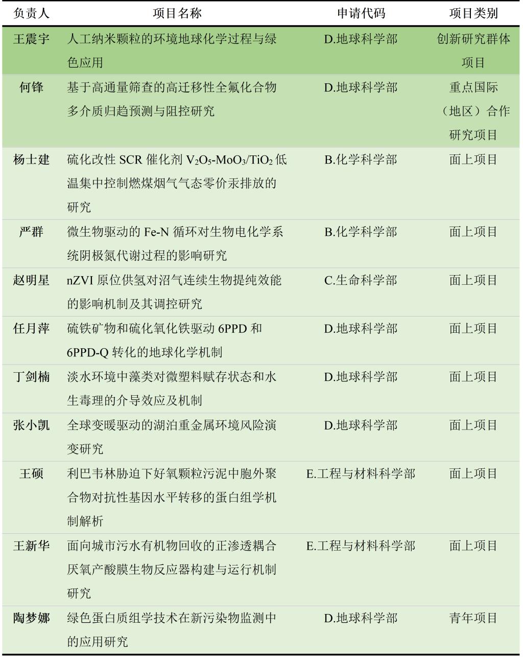 共有11项立项。其中,由王震宇教授牵头申报的创新研究群体项目喜获立项,这是我校环境学科首次获得此类项目资助,标志着我校环境科学科研团队建设取得了显著成效;同时,何锋教授获批重点国际(地区)合作研究项目,另有8位专任教师获得面上项目资助,1位青年教师获得青年科学基金项目资助。