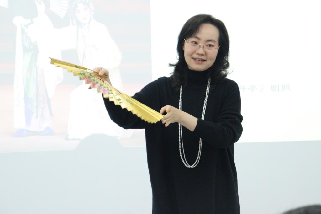 赵老师从曲调清雅、文辞典雅、表演优雅和格调高雅四个方面讲解了昆曲发展的历史、曲谱知识和昆曲声腔的特点。赵教授带领大家欣赏了《牡丹亭》、《长生殿》、《桃花扇》、《孽海记》中的相关片段,她通过丰富的肢体语言和娓娓道来的故事,使听众对昆曲有了更深的认识,讲至兴起时,赵教授亲自上台示范昆曲中扇子的妙用并为在场的师生演唱了《牡丹亭·游园》中最经典的片段《皂罗袍》,在座的同学无不惊叹叫好、意犹未尽。最终,讲座在同学们的热烈掌声中落下帷幕。