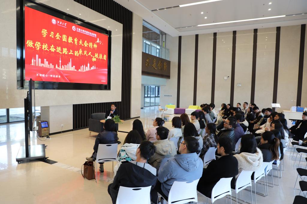 戴月波领学了贯彻全国教育大会精神,按照党中央持续推进教育布局的重要脉络,阐述了全国教育大会在我国教育发展史上重要的里程碑意义,其中,就习近平总书记在重要讲话中系统阐释教育强国的科学内涵和基本路径做了重点学习。同时,戴月波围绕我校在人才培养、工作规划、校区建设等方面的工作,向师生们描绘了学校发展蓝图。他强调,要把学习习近平总书记重要讲话精神与全国教育大会精神紧密结合起来,对标教育强国建设的新要求新任务,聚焦教育科技人才体制机制一体改革,以饱满的热情、昂扬的精神、务实的作风迎接学校第五次党代会召开,以实际行动为学校的发展贡献智慧和力量。