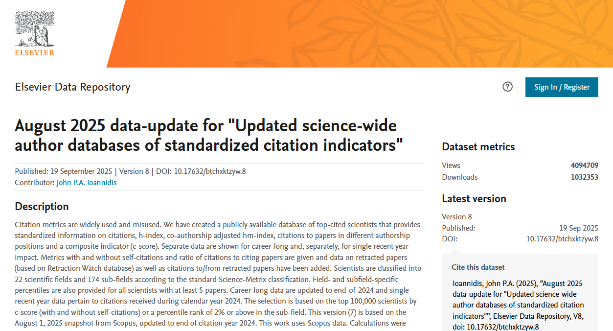 2025年9月,美国斯坦福大学联合爱思唯尔数据库(Elsevier Data Repository)发布了“全球前2%顶尖科学家榜单2025”(Stanford University Top2% Scientists List 2025)。18porn