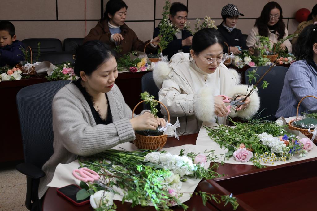 活动现场花香萦绕,在专业艺老师的悉心指导下,教师们发挥自己的创造力和灵巧的动手能力,从花材的选择、颜色的搭配、插花的技巧和花朵的花语解读等方面,将一支支经过认真修剪的玫瑰、康乃馨、郁金香等象征爱和典雅的花朵装扮进花篮。老师们置身于鲜花丛中,兴致盎然,心中充满了喜悦和成就感。通过每一个独特的花篮,女教师们展现了新时代女性的温馨、优雅和美丽。