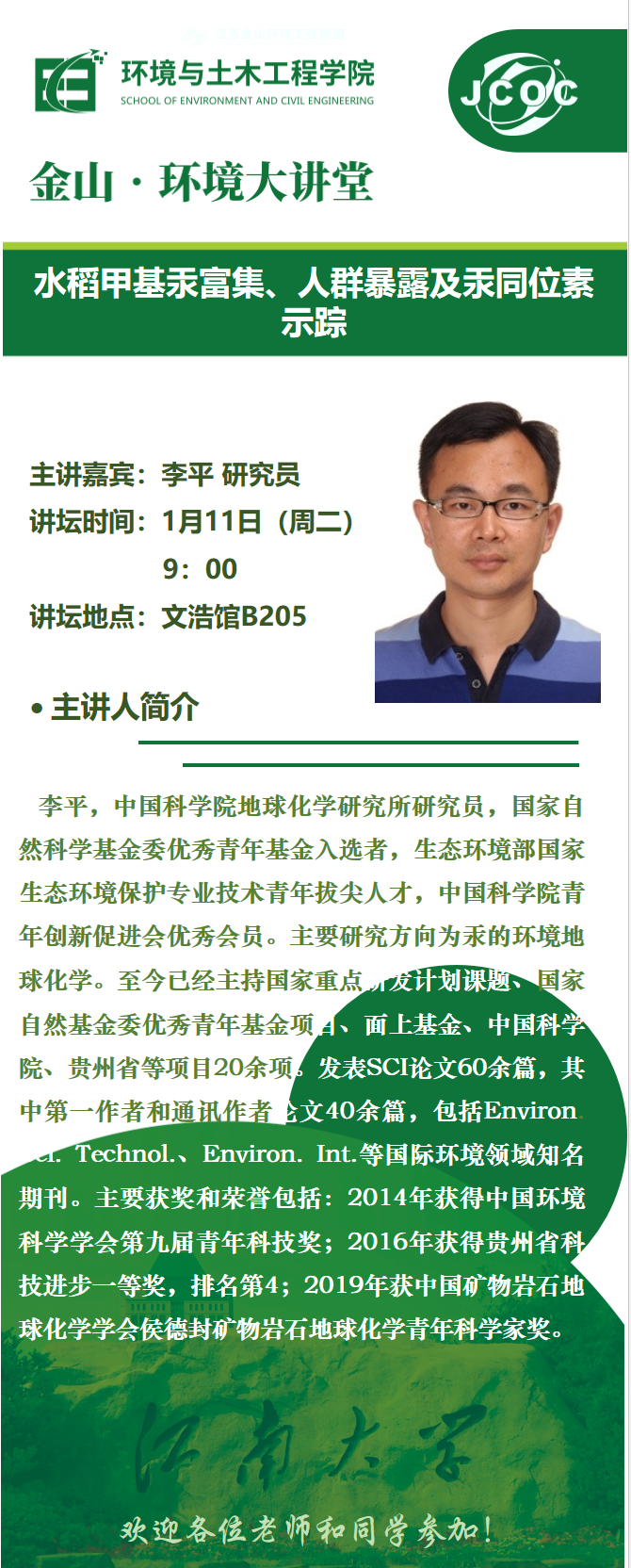 金山·环境大讲堂--李平:水稻甲基汞富集、人群暴露及汞同位素示踪
